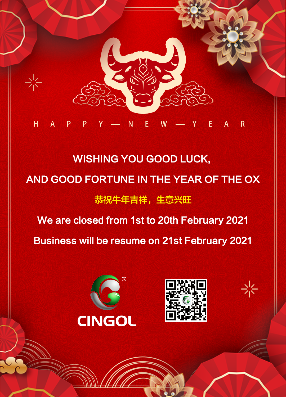 Мы начинаем праздник Китайской весны в конце января и вернемся к работе после 21 февраля 2021 года. Желаем всего наилучшего вам и вашей семье в год Быка. Поздравляю всех вас с китайским Новым годом по лунному календарю.